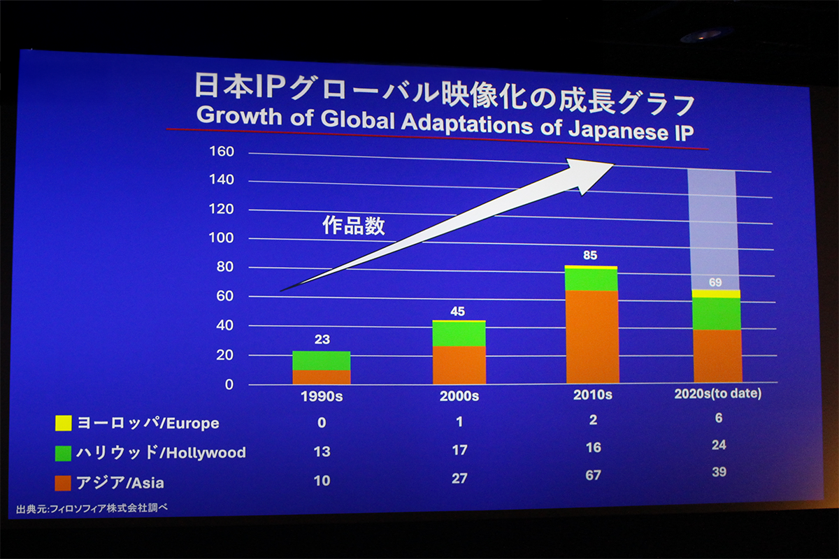 藤村氏は、日本IPのグローバル映像化の現状と地域別の傾向について、自社調査で得られた結果を報告しました。「日本のIPをもとに映像化された作品は、1990年代では23本でしたが、2010年代には85本にまで増えています。2020年代は現状69本ですが、多数の待機作品があることから160本以上になることが予想されます」と今後映像化がさらに加速することを示唆しました。