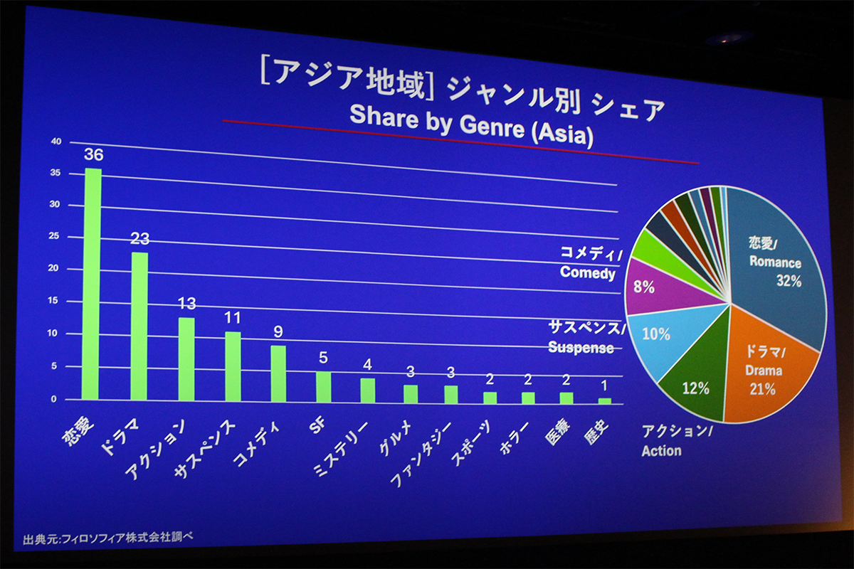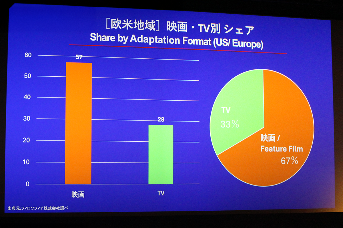 さらに、地域別の特徴として、アジアでは、日本のテレビドラマのリメイクを含むテレビシリーズ化が多く、特に『花より男子』が韓国、台湾、中国など複数の国でリメイクされるなど「恋愛」が人気ジャンルとなっている一方、欧米では、「アクション」「SF」ジャンルの原作が人気で、大型フランチャイズ映画化が主流となっていることを共有しました。