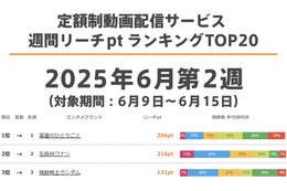 定額制動画配信サービス 週間リーチptランキングTOP20【最新週】