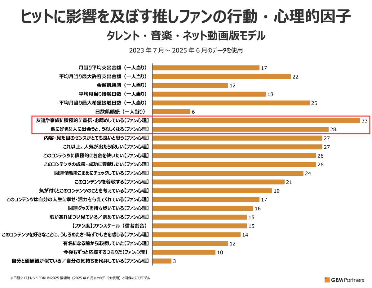 例として、下記の「タレント・音楽・ネット動画など」のヒットポテンシャルのスコアモデルを見てみます。棒グラフの数値は、「推しファン人数」の伸び率への寄与度を指標化したもので、数値が大きいほど推しファン拡大への寄与度が高いことを表しています。「タレント・音楽・ネット動画など」では、「友達や家族に積極的に宣伝・お薦めしている」や「他に好きな人に出会うと、うれしくなる」といったファンコミュニティ拡大に貢献するようなファン心理が形成されていると、その後の「推しファン人数」の伸びに大きく影響することを示しています。