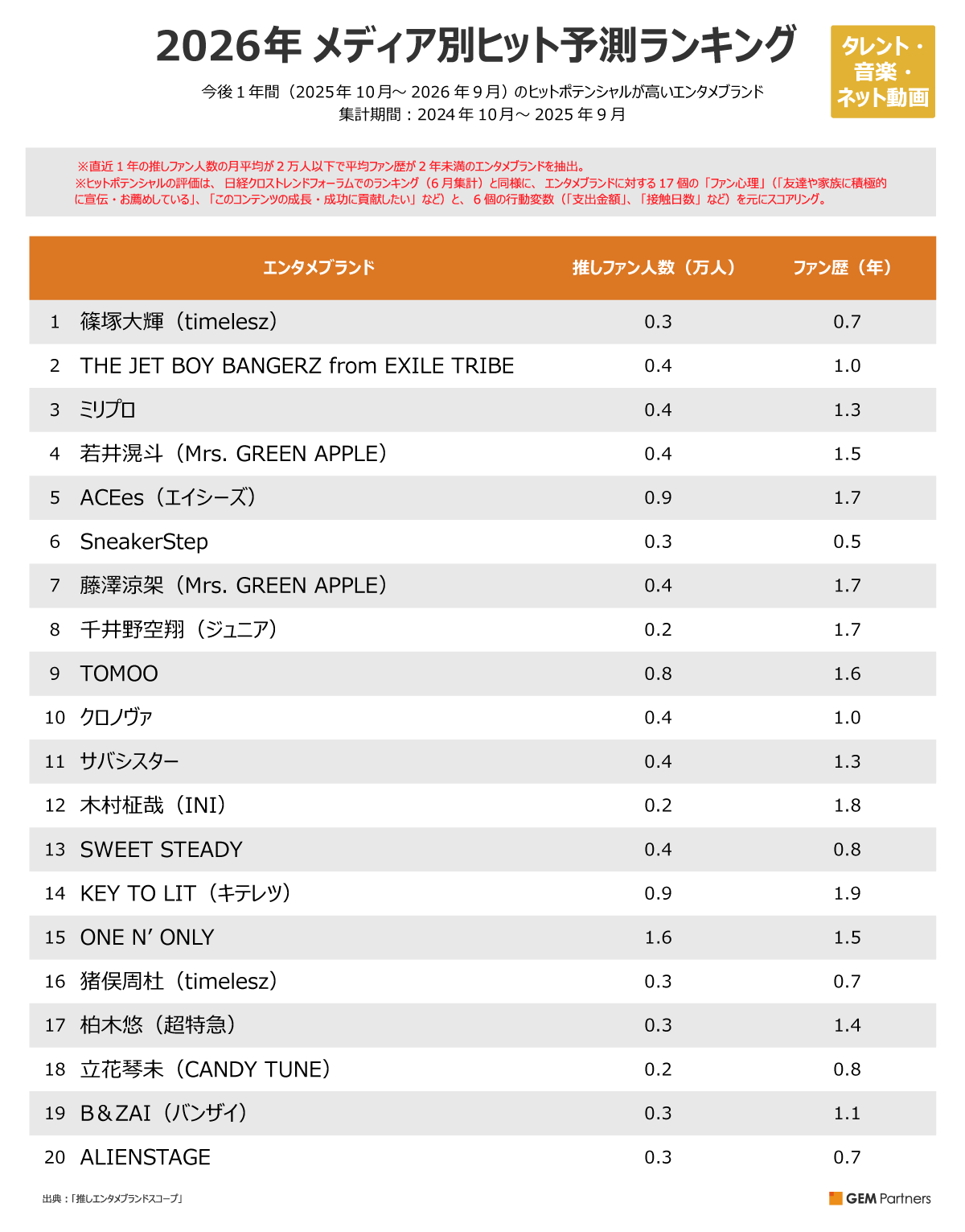 第1回では、メディアを区分せず、ヒット予測の総合ランキングを見てきました。次に、「タレント・音楽・ネット動画など」「アニメ・マンガ・本」「ゲーム」「キャラクター」のメディア別に、ヒットポテンシャルが高いエンタメブランドを抽出します。以下は、「タレント・音楽・ネット動画」の2026年ヒット予測ランキングです。