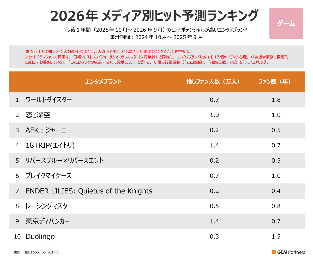 本ランキングは、エンタメブランドへのファン心理や、行動変数の値が基準値(同ジャンルでの平均値)を超えていた場合、1年後に「推しファン人数」がどの程度伸びているかという、「伸び率」を指標化したスコアモデルを構築し、各エンタメブランドに当てはめ、合計スコアの高い順にピックアップしたものです。