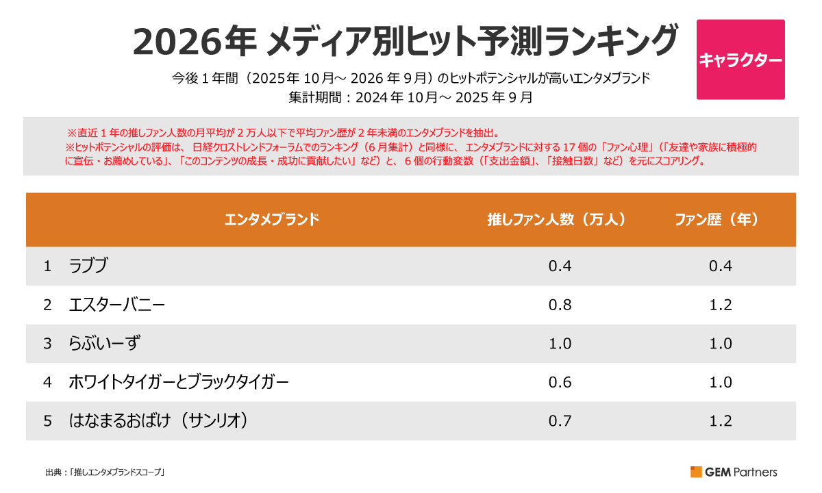「キャラクター」の1位には、中国発の『ラブブ』がランクインしています。前回のデータ集計時の6月から8月にかけて推しファンが大幅に増加。ただし、9月調査時の「推しファン人数」が減少しているため、今後人気を持ち直せるか注目されます。