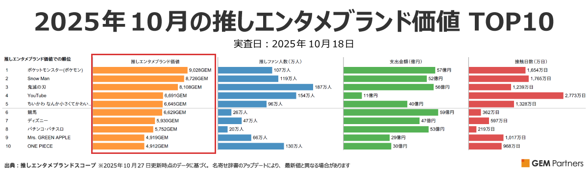 2025年10月の「推しエンタメブランド価値」ランキングで1位を獲得したのは『ポケットモンスター(ポケモン)』でした。10月16日にシリーズ最新作となるNintendo Switch・Nintendo Switch2専用ゲームソフト「Pokémon LEGENDS Z-A」が発売されたことで、前月の4位から1位へと躍り出ました。「推しファン人数」は前月比25万人増、「支出金額」は同21億円増、「接触日数」も同406万日増とすべて伸長したことで、「推しエンタメブランド価値」も2,950GEM増加し、9,028GEMとなりました。