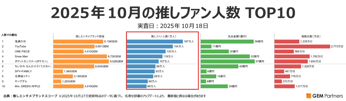 メディアを横断して、推しているファン(=推しファン)が作り出す総合価値が高いエンタメブランドはなにか。推し活を定量的に測る「推しファン」データ(「推しファン人数」「支出金額」「接触日数」)からエンタメブランドの経済価値を数値化し、ランキングとして発表いたします。今回は10月18日調査から集計結果をお届けします。