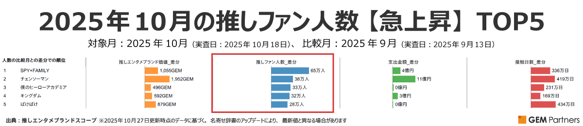 「推しファン人数 【急上昇】」TOP5の1位は『SPY×FAMILY』です。10月4日に放送が始まったTVアニメシーズン3の影響もあり、「推しファン人数」を前月から65万人増やしています。2位は9月19日に公開された劇場版『チェンソーマン レゼ篇』がヒットを続けている『チェンソーマン』。前月も4位に入りましたが、今月も躍進が続きさらに順位を上げました。そのほか、3位には10月4日にTVアニメのFINAL SEASONが始まった『僕のヒーローアカデミア』、4位には10月5日にTVアニメの第6シーズンが始まった『キングダム』、5位には9月29日に放送開始となったNHK連続テレビ小説『ばけばけ』がそれぞれ入りました。