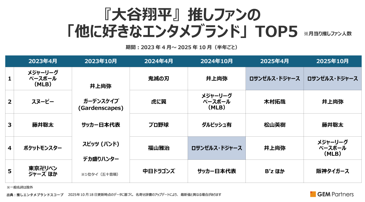 次に、『大谷翔平』の推しファンが『ドジャース』推しになる可能性を探るために、『大谷翔平』の推しファンが挙げる「他に好きなエンタメブランド」TOP5を半年ごとに見てみます。