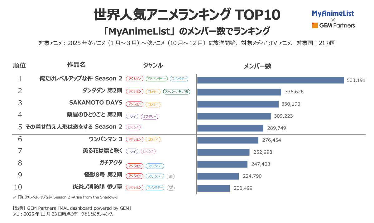 『俺レベ』が世界21カ国で首位、アジアでは『SAKAMOTO DAYS』、アメリカでは『ダンダダン』が上位に~世界人気アニメランキング2025年