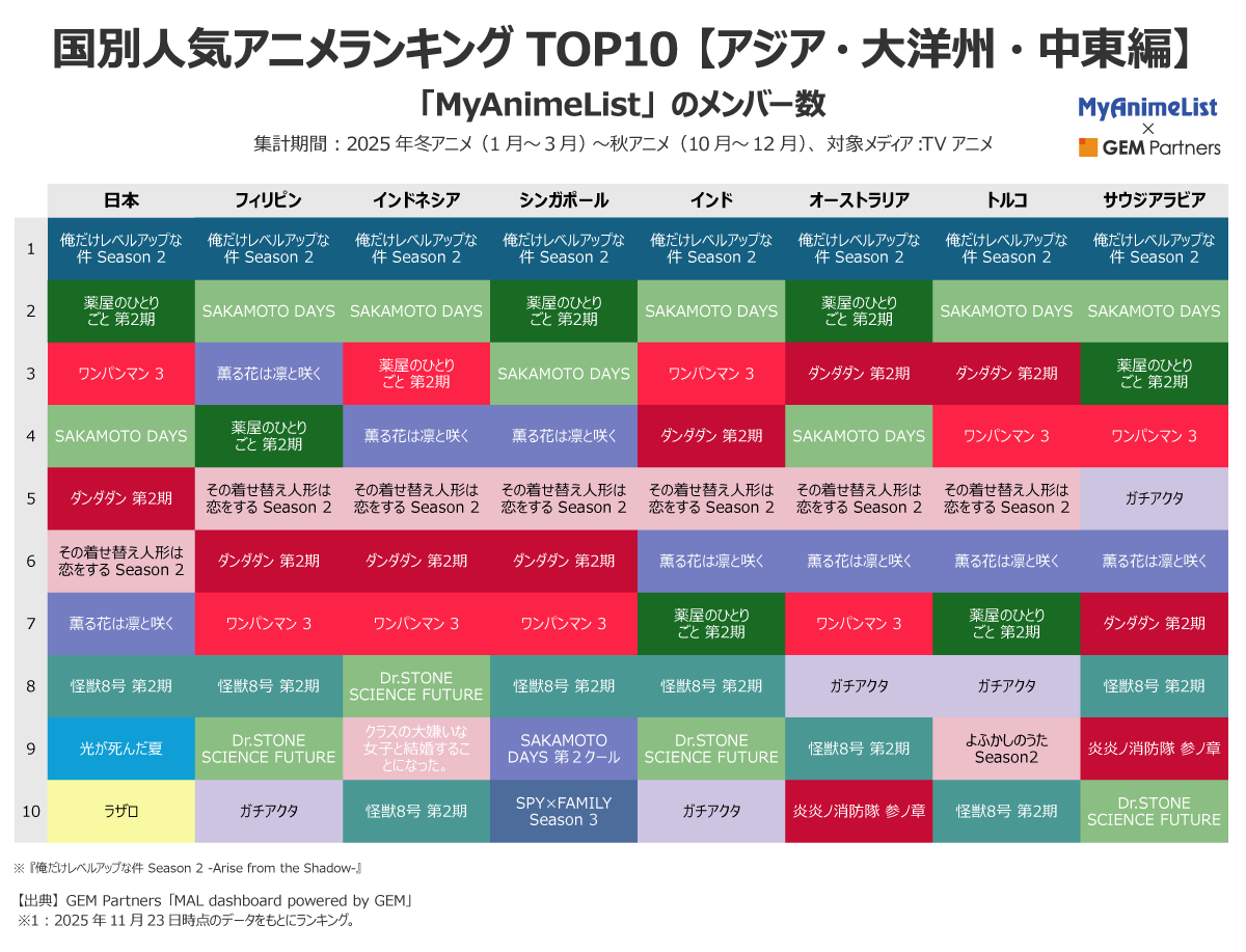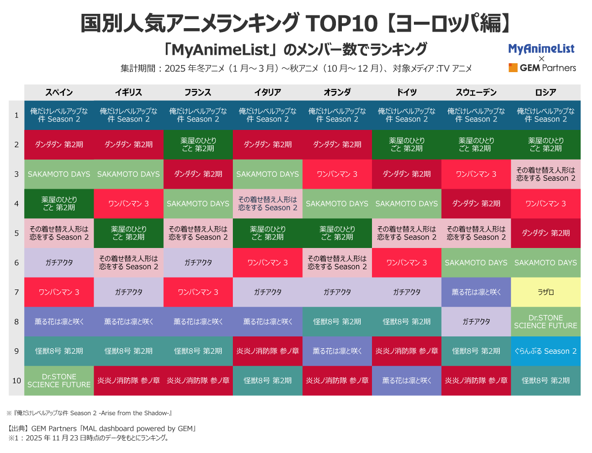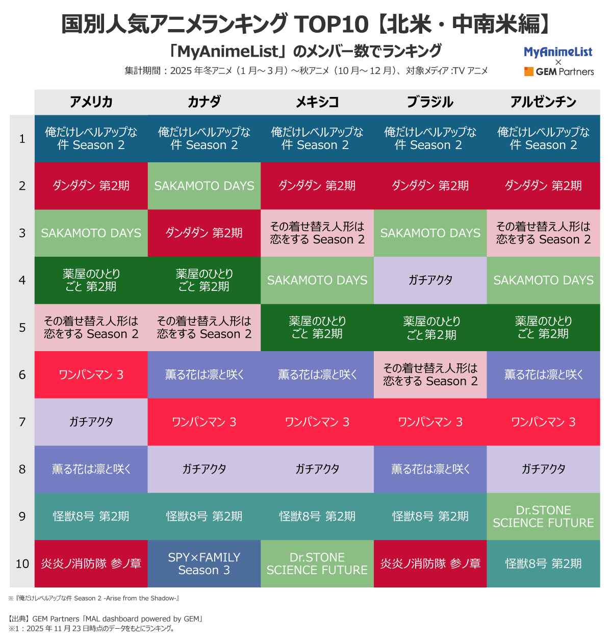 ヨーロッパでも、1位は『俺だけレベルアップな件』が独占しましたが、2位は国によって二分される結果となりました。イギリス、スペイン、イタリア、オランダでは『ダンダダン 第2期』が2位を獲得していますが、フランス、ドイツ、スウェーデン、ロシアでは『薬屋のひとりごと 第2期』が2位にランクインしています。このようにヨーロッパ内でも、アクション派とドラマ派で傾向が分かれました。