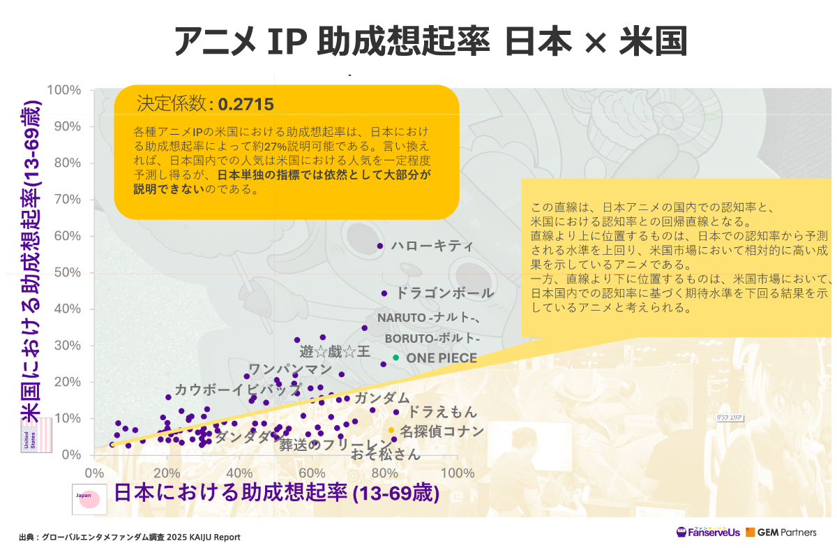 世界中がインターネットにより強く結びついている現在、日本と海外で人気を博すアニメが共通しているケースは多くあります。しかし、果たして日本での人気は、どの程度海外市場と相関するのでしょうか。下記は、日本アニメIPの国内と米国における助成想起率をマッピングした図です。
