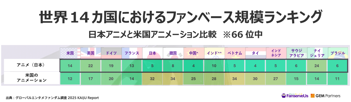 対象国14カ国中、11カ国で「米国のアニメーション」よりも「日本アニメ」のファンベース規模が上位にランクインした。