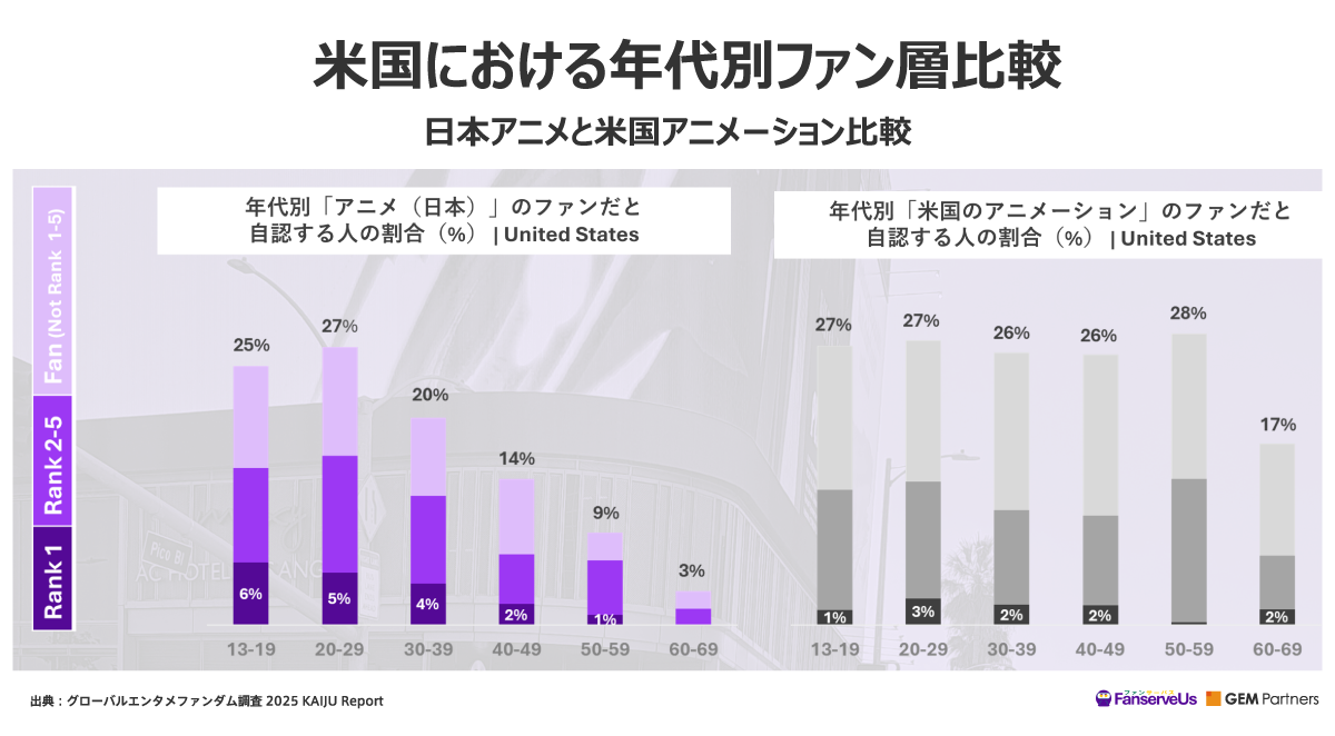 上記から分かるように、13~19歳と20代においては、日本アニメと米国アニメーションファンの割合はほぼ互角です。 グラフの色が最も濃い部分は“Rank1”すなわち「日本アニメ、もしくは米国アニメーションが一番好き」と回答した人の割合を指しており、13~19歳では日本アニメが6%と、米国アニメーションの1%を大きく上回っています。この意味合いとして、マッカラム氏は「若年層ファンは、米国アニメーションよりも日本アニメを支持する傾向を成人後もそのまま維持する可能性があり、特にファミリー視聴に適した作品であれば、自らの子世代に共有することも考えられます。ファンダムが個々人のライフサイクルにおいて持続するか、もしくはノスタルジーとして再び評価される場合、家庭内で視聴される可能性は一層高まります」と分析しています。