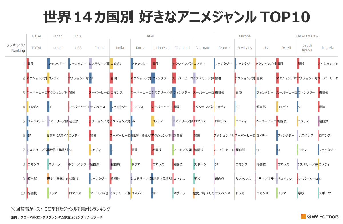 未来の成功を確実にするためには、各国での浸透・人気につながる、そもそもの市場の違いに着目する必要があります。例えば、「好きなアニメジャンル」を各国で比較すると、ファンダムが少しずつ異なることが分かります。世界各国の特色を分析することが、どんな作品がどこで人気を得やすいのか、理解する一助となるでしょう。