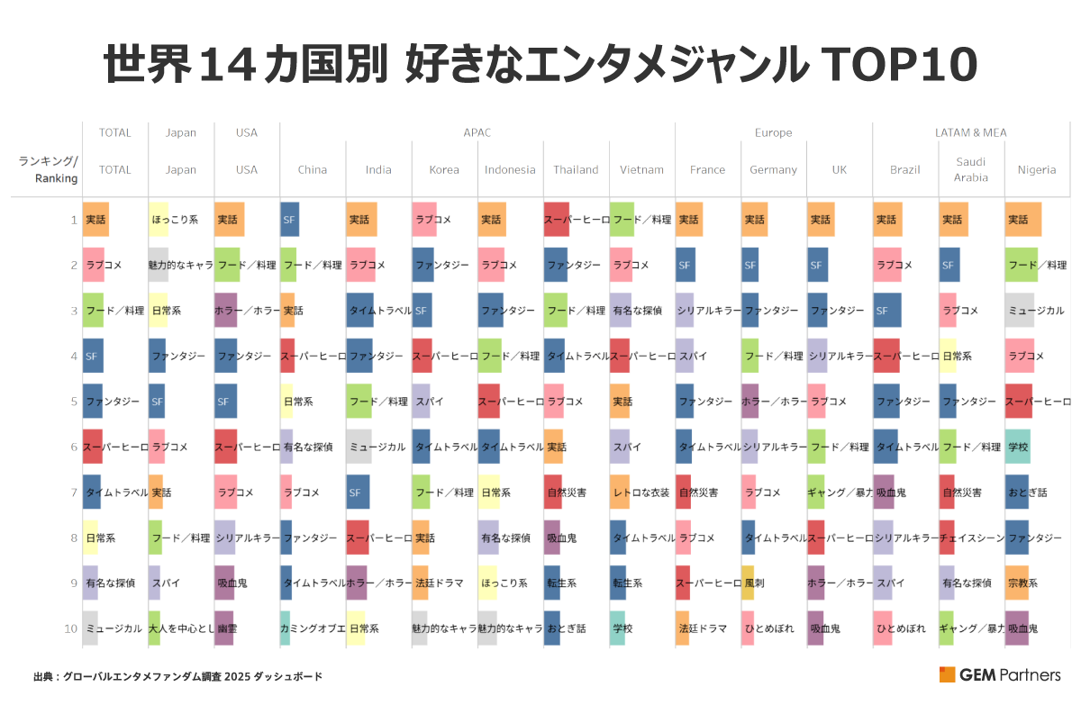 各国の「好きなエンタメジャンル」のランキングを見ると、米国、ヨーロッパ、そしてブラジル、サウジアラビア、ナイジェリアで、「実話」が1位を獲得おり、リアルな物語への関心が高い国が多いことが分かります。