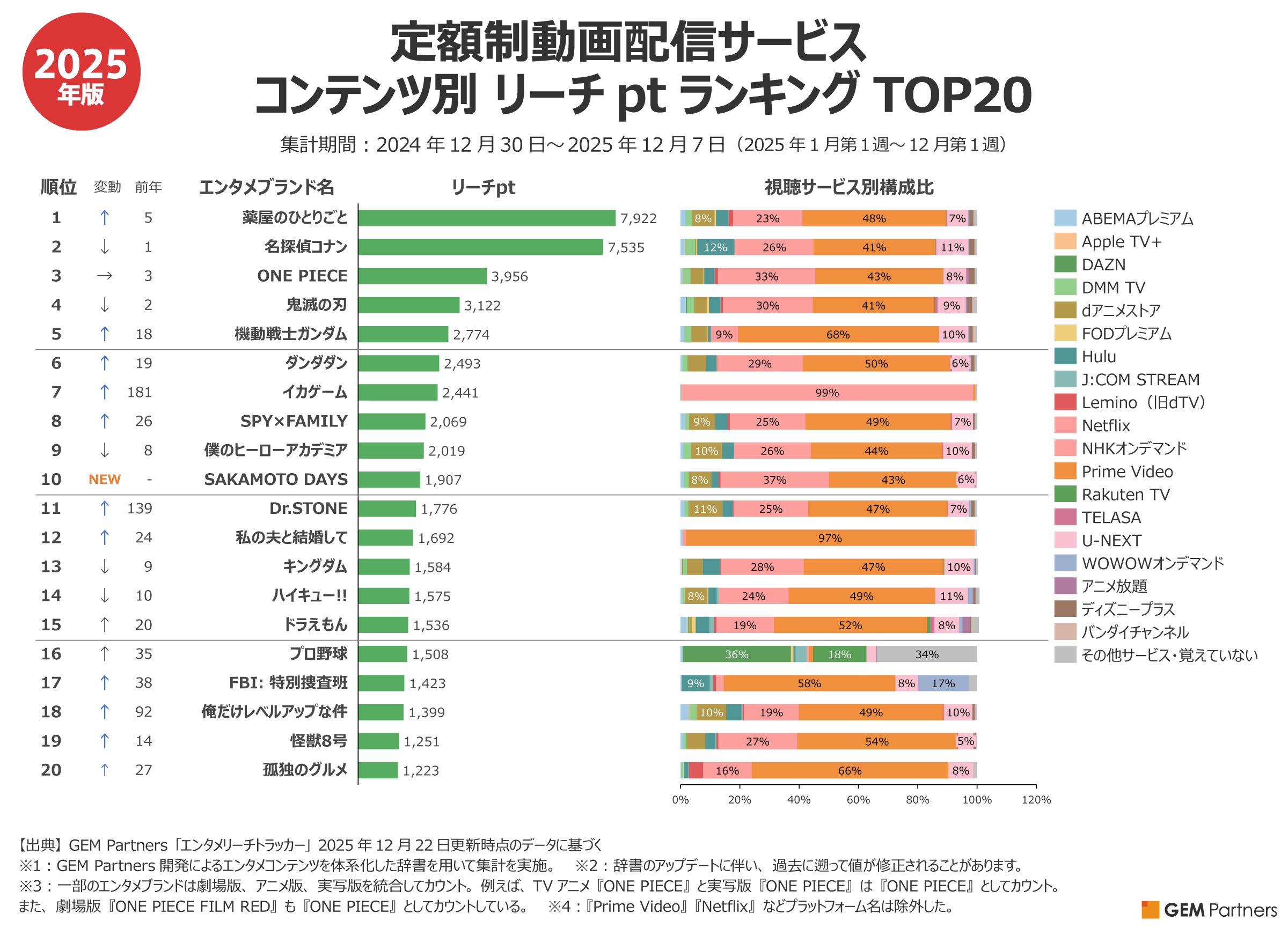 上記は、サービス横断で集計した定額制動画配信サービスのコンテンツ別リーチptランキングTOP20です。2025年の首位を獲得したのは『薬屋のひとりごと』でした。1月に始まったアニメ第2期の2クール連続配信によりリーチptを急激に伸ばし、前年比約3,500pt増の7,922ptを獲得。前年5位から上昇しました。視聴サービス構成比をみると、Prime Video(48%)、Netflix(23%)、dアニメストア(8%)となっています。また、TVアニメ第3期の第1クールが2026年10月から、第2クールが2027年4月から配信されることが発表され、来年以降のリーチ拡大にも期待が高まります。