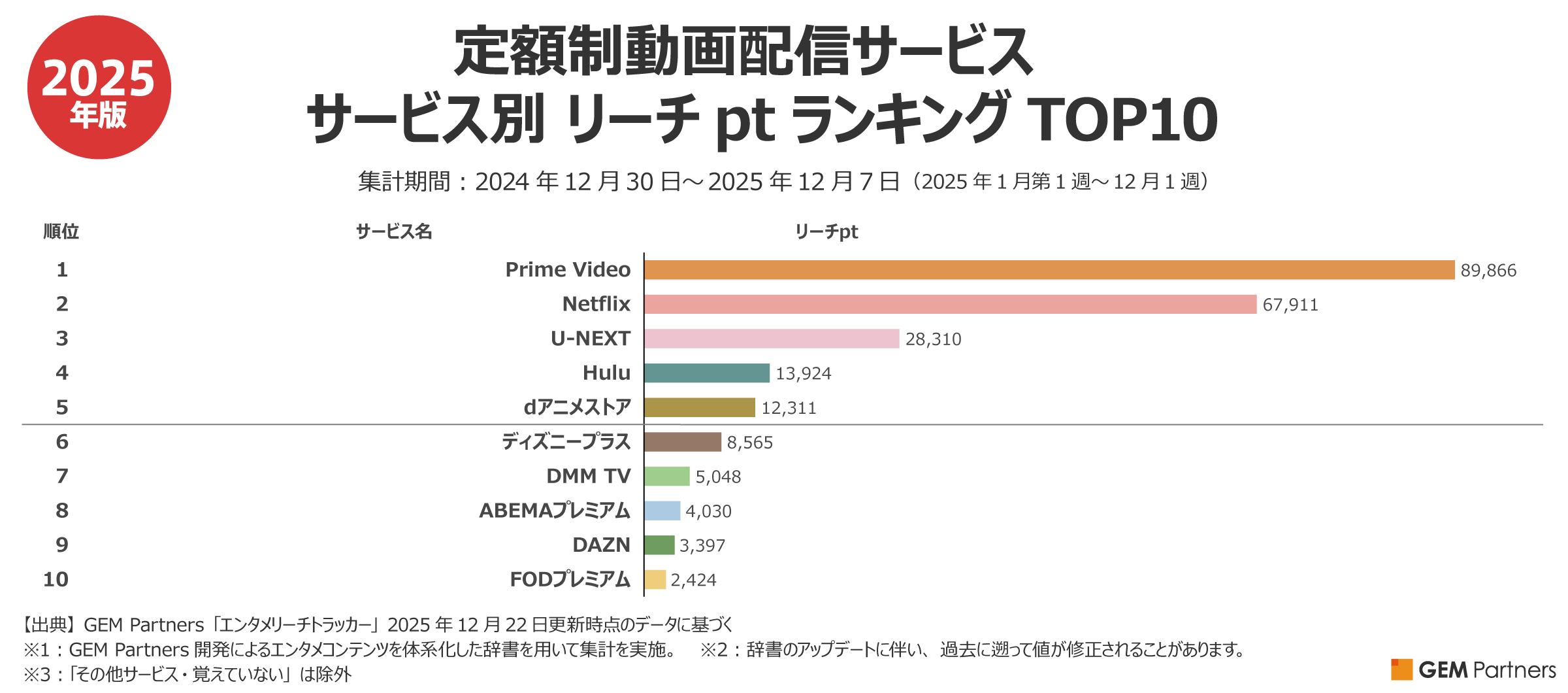 映像、マンガ・書籍、ゲーム、音楽、ラジオなどのメディアを横断してエンタメブランドの真のリーチを比較・評価できる指標“リーチpt※1”をもとに、2025年※2のランキングを発表いたします。特集第1回は、定額制動画配信サービスに注目し、コンテンツ別TOP20とともに、視聴サービス別構成比を明らかにしました。
