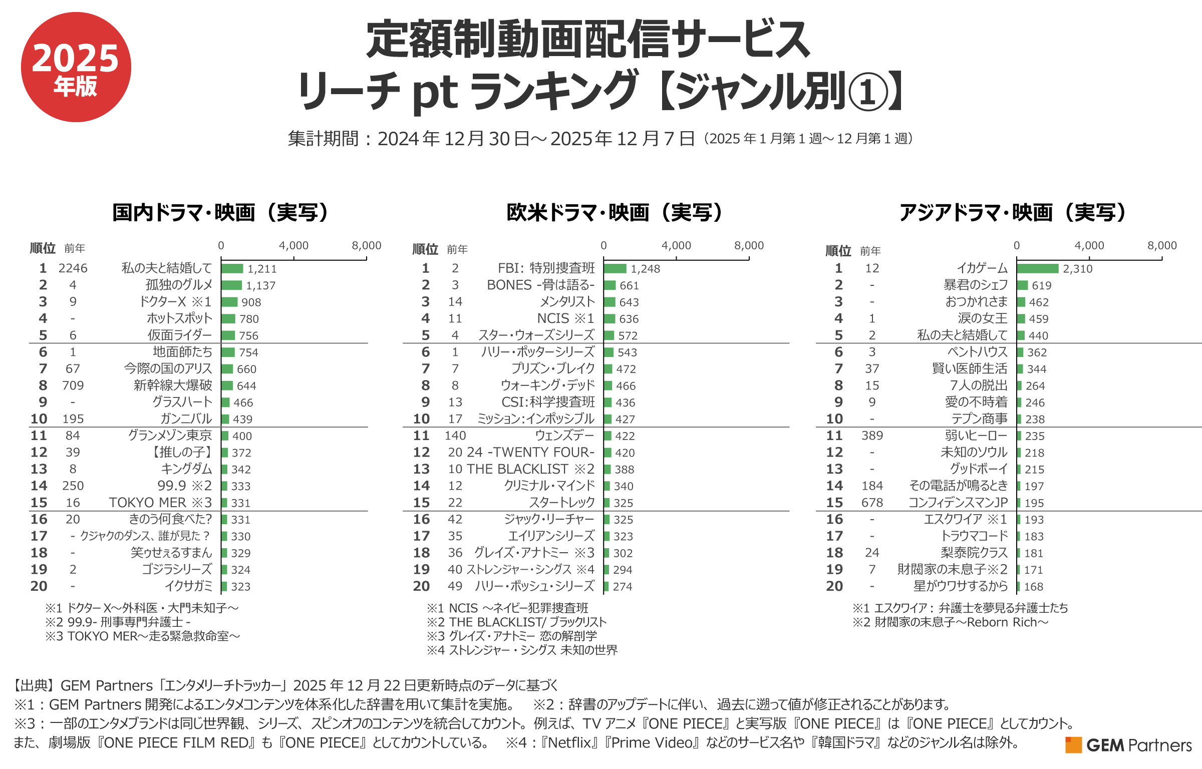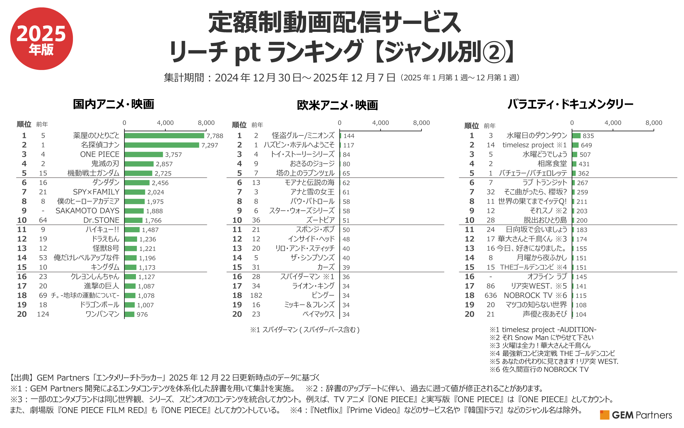 映像、マンガ・書籍、ゲーム、音楽、ラジオなどのメディアを横断してエンタメブランドの真のリーチを比較・評価できる指標“リーチpt※1”をもとに、2025年※2のランキングを発表いたします。特集第2回は、定額制動画配信サービスで観られたコンテンツをより深掘りし、国内・欧米・アジア、実写・アニメなどジャンル毎のTOP20をご紹介します。