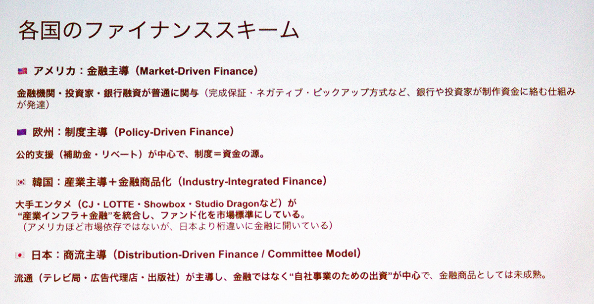 ハリウッドでは100億〜200億円規模の予算が動きますが、これは事業会社が出資するだけでなく、銀行からの「融資」が大きな役割を果たしています。伊部氏は映画『ハリウッドがひれ伏した銀行マン』を例に挙げ、「配給契約書を担保にした融資(プリセールス)」や「完成保証(コンプリーション・ボンド)」という銀行家・金融家が生み出した仕組みが、現在のハリウッドの基礎になっていると解説しました。また大西氏は、メジャースタジオが活用する「複数作品を束ねた資金調達(スレートファイナンス)」の存在についても触れました。