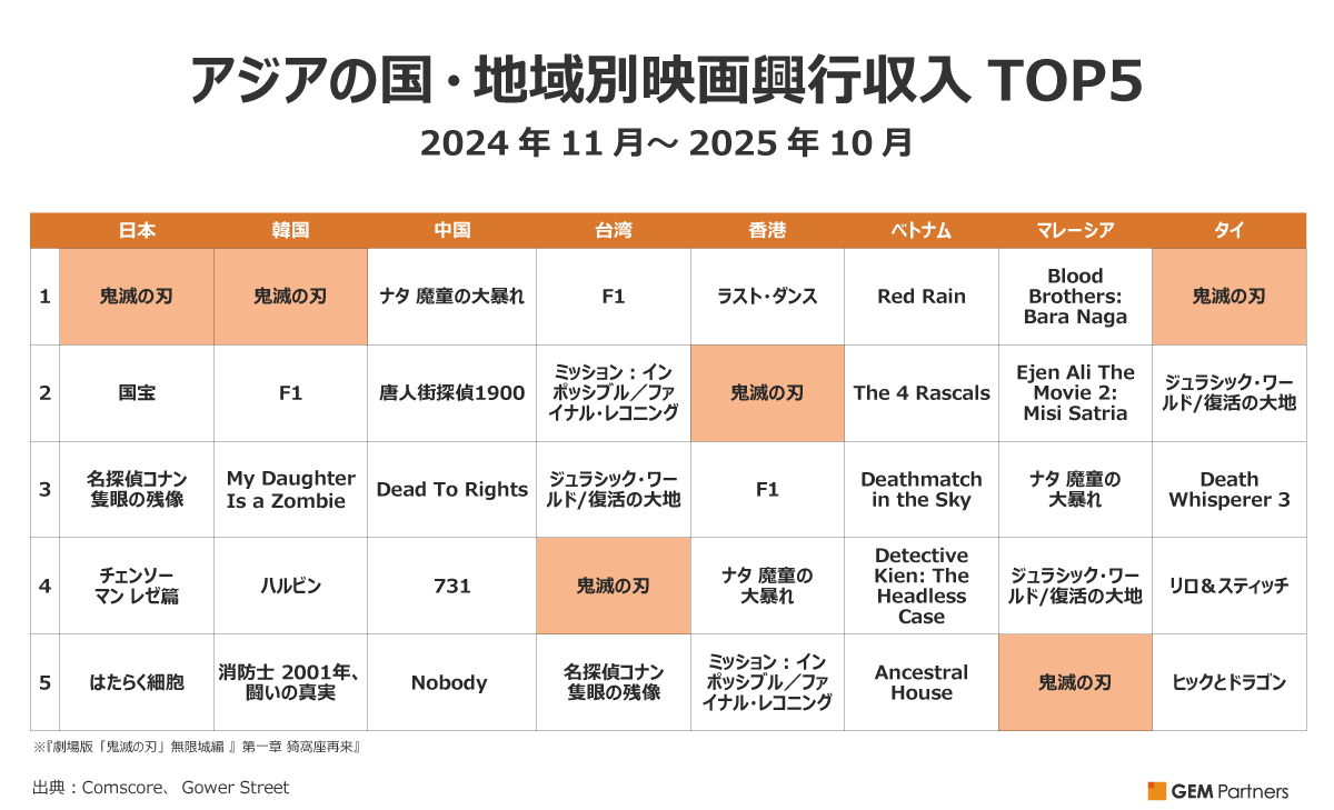 アジア各国別ランキングの特色:ローカル作品の伸びと『劇場版「鬼滅の刃」無限城編 第一章 猗窩座再来』の存在感