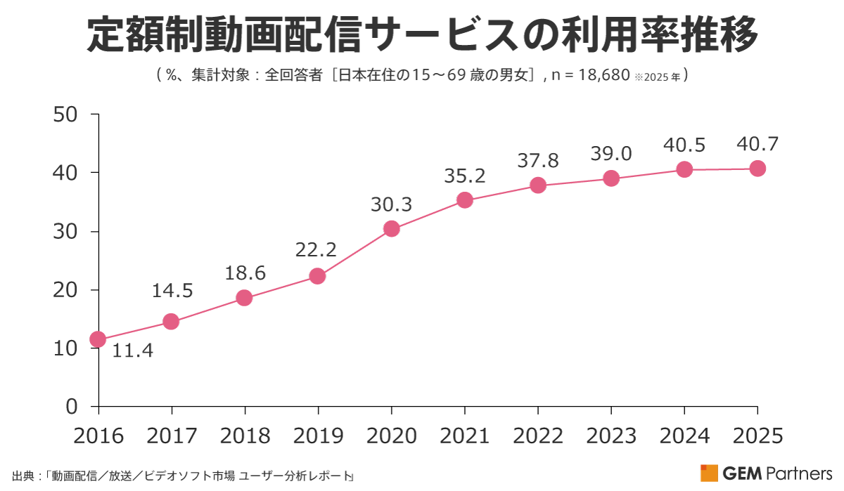 まず、SVOD全体の利用率の推移を見てみます。日本全国に住む15~69歳のなかでSVOD利用率は、2016年には11.4%でしたが、この10年で約3.6倍となり、2025年には40.7%と約4割まで広がりました。