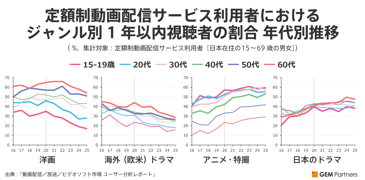 全体でシェアを落とした「洋画」ですが、年代別に見るとその減少幅には差があります。15-19歳、20代の若年層では、2020年以降に利用率の低下が顕著に現れています。一方、50代以上は減少してはいるものの、若年層ほどドラスティックではありません。