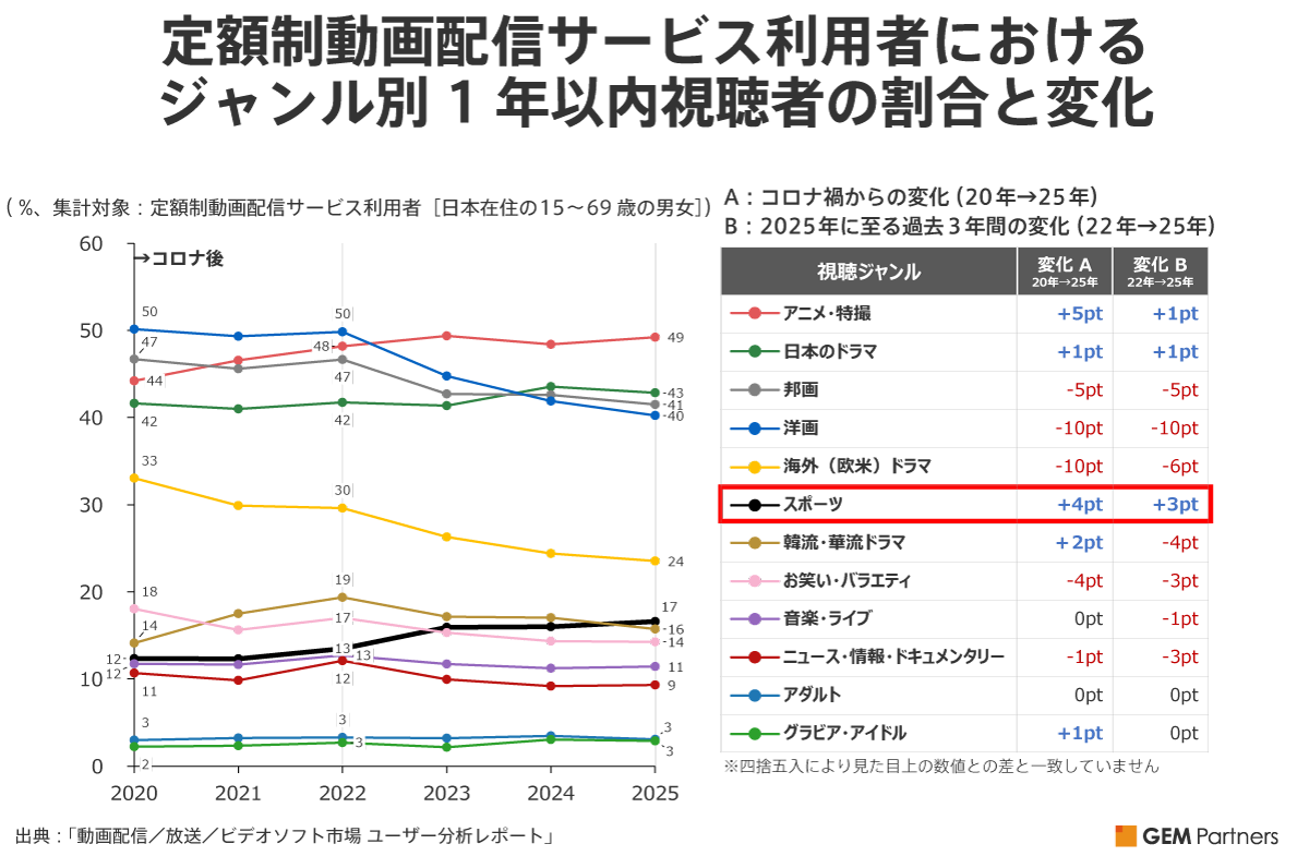 上記左のグラフは、2020年のコロナ禍後に期間を絞ったジャンル別の視聴者割合の推移です。右側の表は、コロナ禍から2025年までの変化(A)、およびコロナ禍が収束した新型コロナウイルス感染症の5類感染症移行後の期間となる過去3年間の変化(B)です。「アニメ・特撮」は前述の通り、コロナ禍以降(A)に最も伸びていますが、コロナが収束したこの3年間(B)は停滞しています。一方、割合としては他ジャンルに比べて少ないですが、コロナ禍以降(A)も大きく増加し、さらにコロナ収束後(B)に最も伸長しているのが「スポーツ」です。