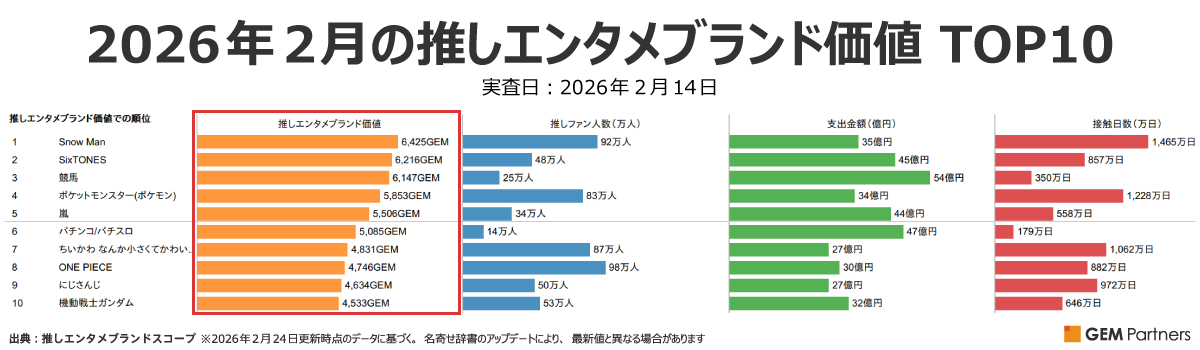 メディアを横断して、推しているファン(=推しファン)が作り出す総合価値が高いエンタメブランドはなにか。推し活を定量的に測る「推しファン」データ(「推しファン人数」「支出金額」「接触日数」)からエンタメブランドの経済価値を数値化し、ランキングとして発表いたします。今回は2月14日調査から集計結果をお届けします。