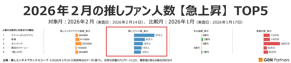 2位は『教場』でした。同名小説シリーズを映像化したテレビドラマの集大成として、1月1日に「教場 Reunion」がNetflixで独占配信され、2月20日の「教場 Requiem」の劇場公開に向けて推しファンが増加しました。3位には2月6日に開幕した「ミラノ・コルティナ2026冬季オリンピック」の影響により『オリンピック』が浮上。4位は『葬送のフリーレン』で、前述した背景もあり12月より3カ月連続TOP5に入っています。5位は『【推しの子】』で、1月14日からTVアニメ第3期が放送されており、前月に続いてのランクインとなりました。
