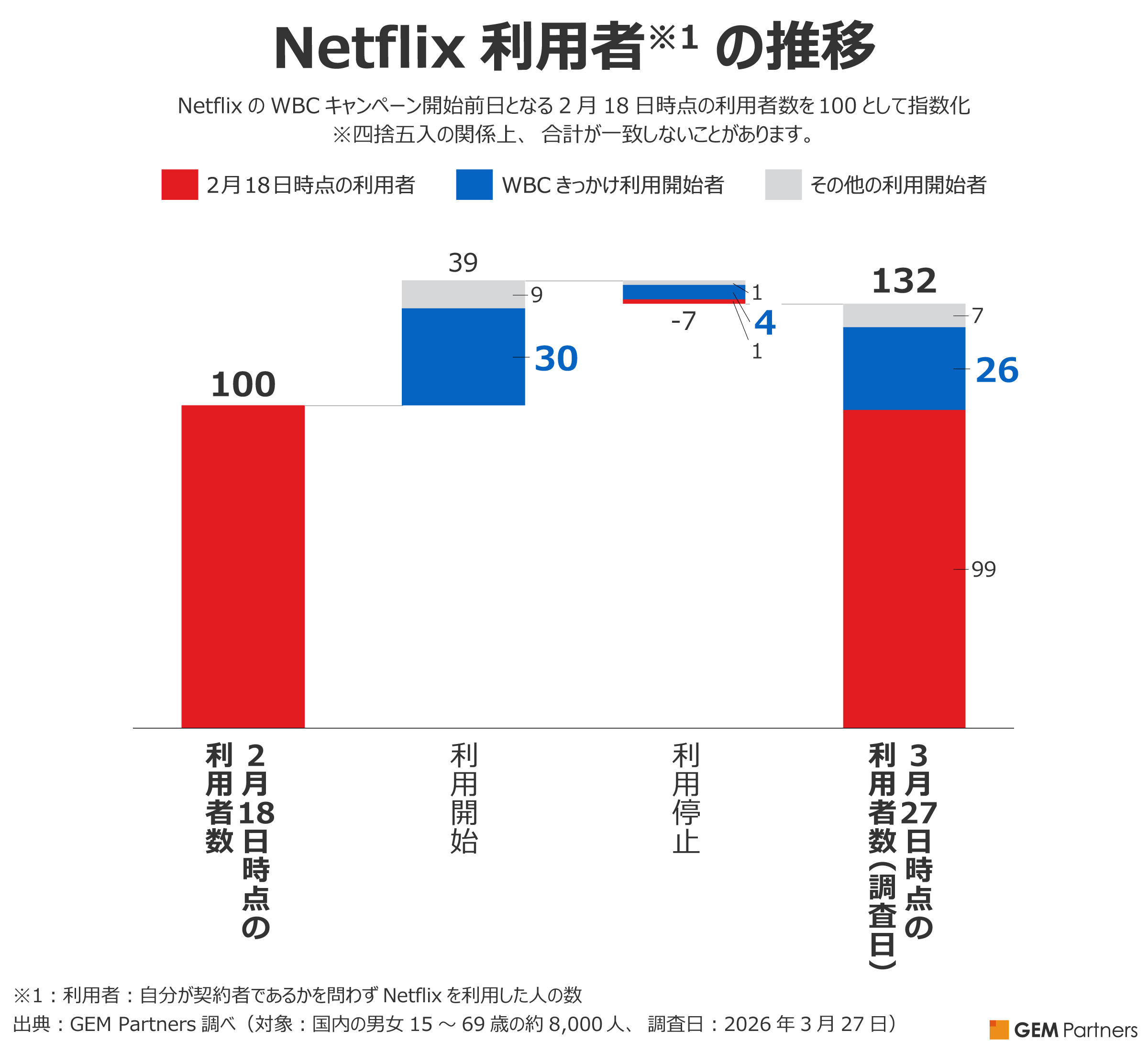 Netflixによる150億円規模とも報じられる「ワールドベースボールクラシック(WBC)」の独占放映権獲得は、日本の動画配信市場におけるプラットフォーム成長戦略と映像産業の在り方に一石を投じる事例となりました。この巨額投資はNetflixの利用者基盤にどのような影響を及ぼしたのでしょうか。GEM Partnersではこの動向を掴むため、WBC終了後の3月27日に国内の男女15~69歳の約8,000人を対象にインターネットアンケートを実施。その定量的なインパクトを分析します。