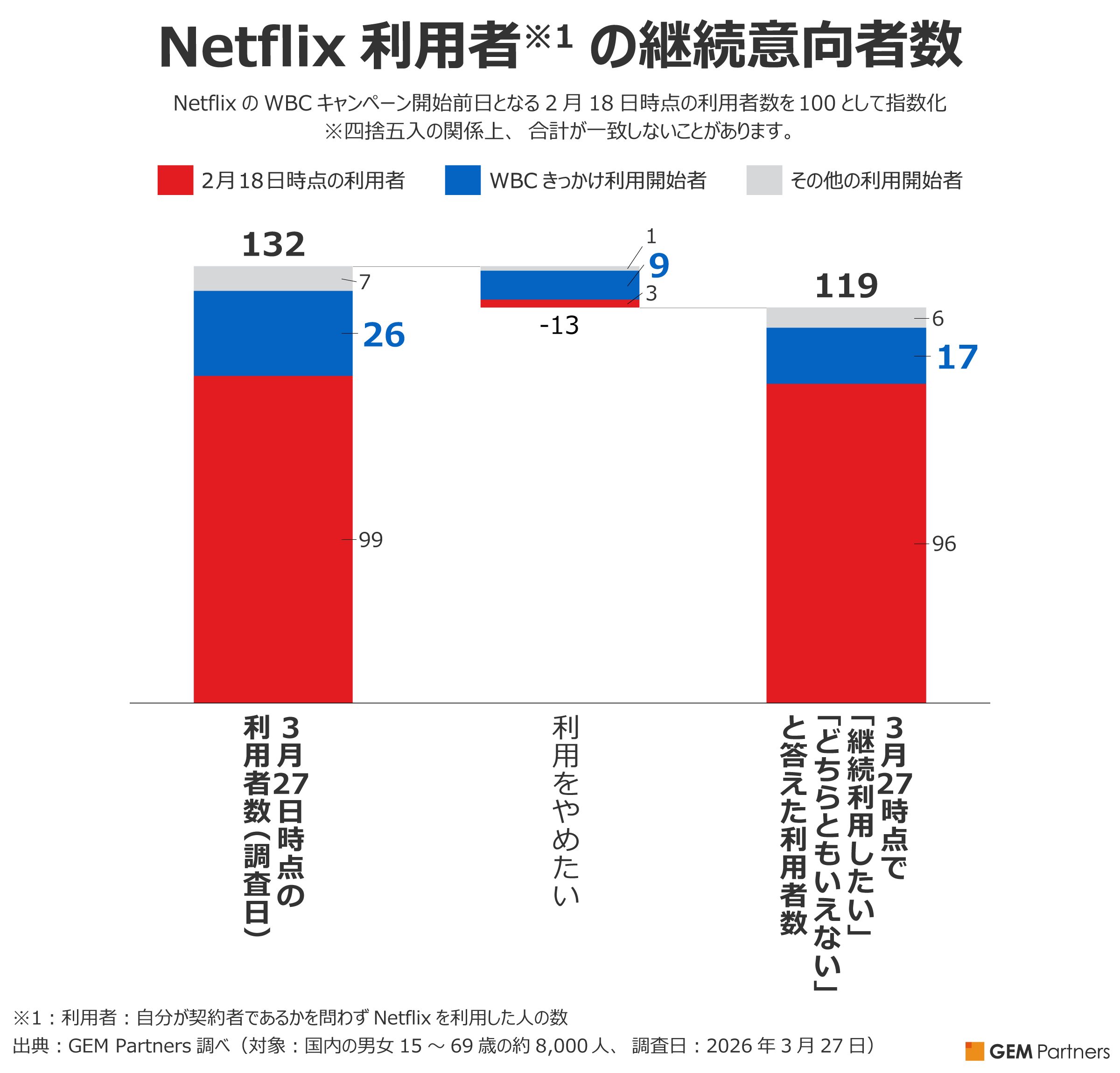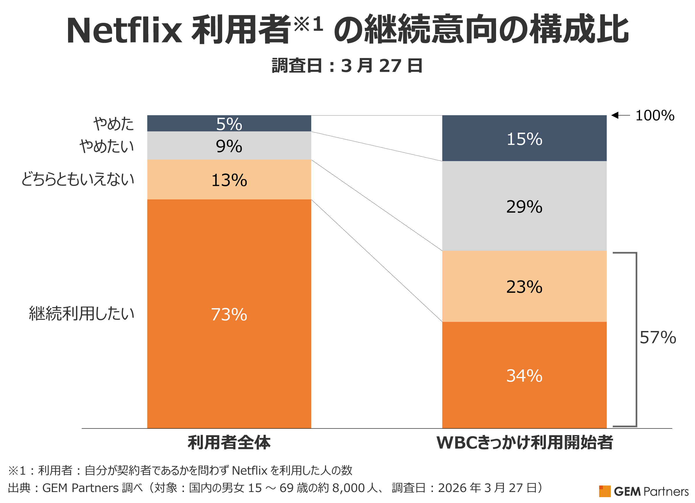 WBC効果で利用者30%増、継続意向は高くはないが、「能動的に利用」の割合が高い~Netflixの利用者構造をデータで読み解く