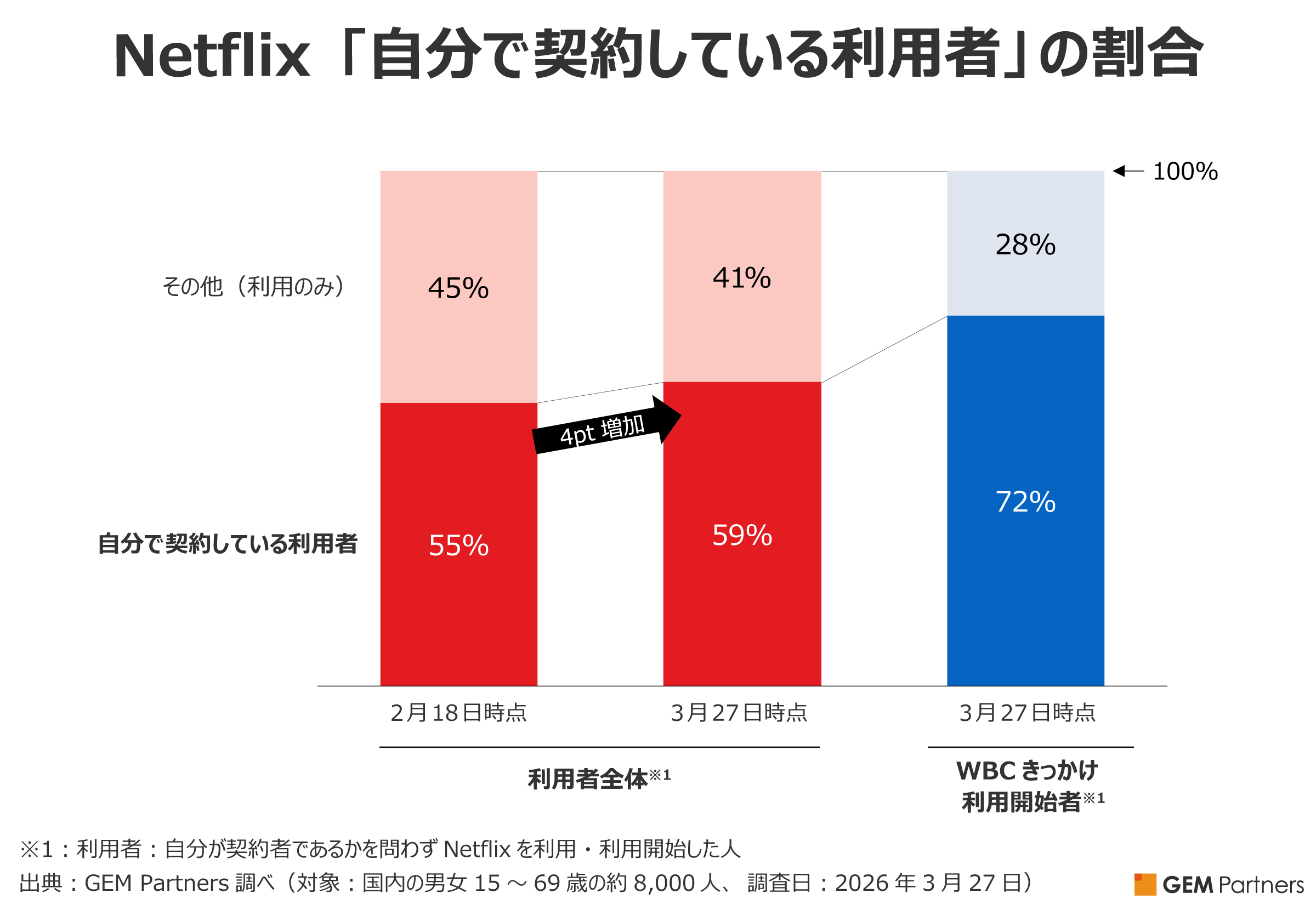 まず、Netflix利用者全体における「自分で契約している利用者」の割合を確認しました。キャンペーン開始前の2月18日時点では55%でしたが、WBC終了後の3月27日時点では59%と4ポイントの改善が見えました。ここで特筆すべきは「WBCきっかけ利用開始者」の構成比です。3月27日時点の同セグメントにおける「自分で契約している利用者」の割合は72%に達しており、Netflix全体の水準(約6割)を上回りました。