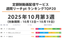 定額制動画配信サービス 週間リーチptランキングTOP20【最新週】