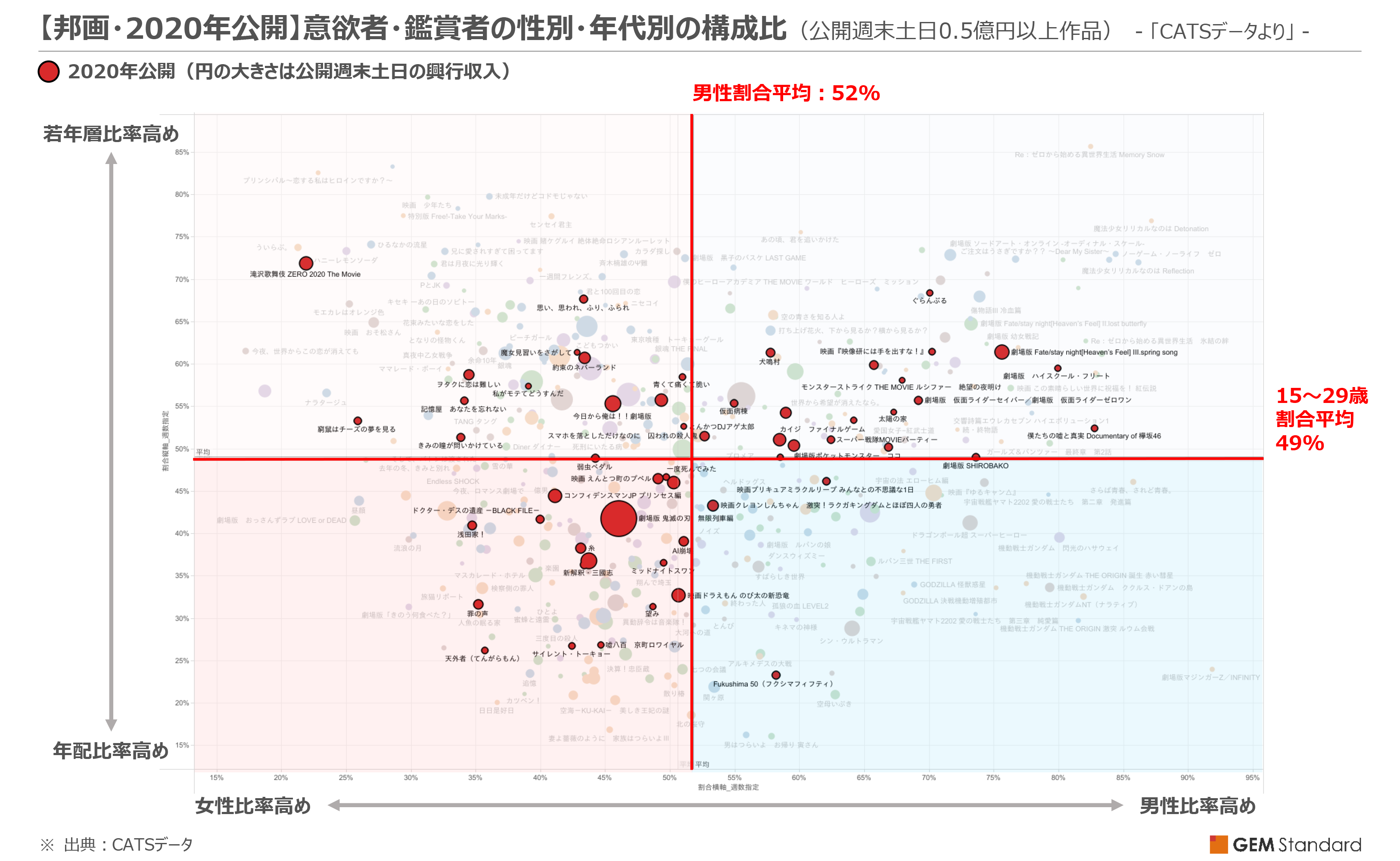 各年毎に年代割合、男女割合の平均線を境に4象限に分割しました。各作品のマッピング箇所が濃い青なら「年齢層高め、男性多め」、薄い青なら「年齢層若め、男性多め」、濃いピンクなら「年齢層高め、女性多め」、薄いピンクなら「年齢層若め、女性多め」となります。