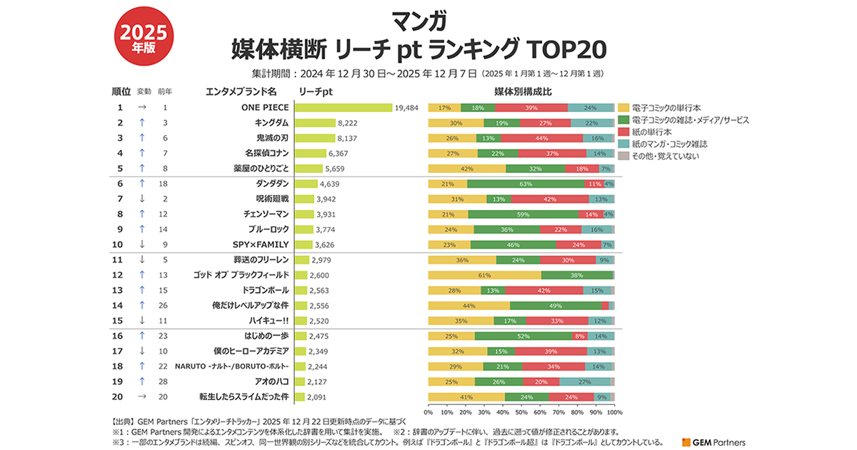 マンガ『ONE PIECE』が電子・紙横断で首位~2025年最も読まれたマンガを媒体横断で調査