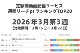 定額制動画配信サービス 週間リーチptランキングTOP20【最新週】