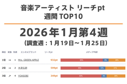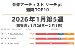 音楽アーティスト リーチpt 週間TOP10(2026年1月...