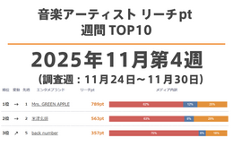 音楽アーティスト リーチpt 週間TOP10(2025年11...