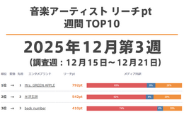 音楽アーティスト リーチpt 週間TOP10(2025年12...