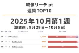 「エンタメリーチトラッカー」では、映像/マンガ/書籍/アプリゲーム/家庭用・PCゲーム/音楽[アーティスト]/ラジオ・ポッドキャストの各メディアにおいて、エンタメブランド名を冠したコンテンツにリーチした(触れた)人の多さを調査し、リーチptとして集計しています。本ランキングでは、7メディアを統合したリーチptが多いエンタメブランドの2025年10月第2週の週間TOP10を発表します。