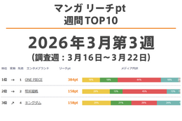 「エンタメリーチトラッカー」では、映像/マンガ/書籍/アプリゲーム/家庭用・PCゲーム/音楽[アーティスト]/ラジオ・ポッドキャストの各メディアにおいて、エンタメブランド名を冠したコンテンツにリーチした(触れた)人の多さを調査し、リーチptとして集計しています。本ランキングでは、7メディアを統合したリーチptの前週との差分が大きいエンタメブランドの2026年3月第4週の週間TOP10を発表します。