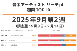 複数の定額制動画配信サービスを横断集計した2025年9月第3週(9月15日~9月21日)のエンタメブランド別(※3)の週間リーチptランキングを発表します。