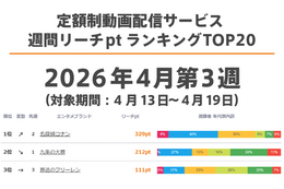 定額制動画配信サービス 週間リーチptランキングTOP20【最新週】