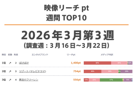 GEM Partners株式会社では映像/マンガ/書籍/アプリゲーム/家庭用・PCゲーム/音楽[アーティスト]/ラジオ・ポッドキャストの各メディアにおいて、エンタメブランド名を冠したコンテンツにリーチした(触れた)人の多さを調査し、リーチptとして集計しています。本ランキングでは、電子コミック・紙、単行本・雑誌・サービスを横断集計した2026年3月第2週の値からマンガ 週間リーチptランキングを発表します。