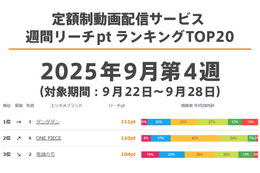 定額制動画配信サービス 週間リーチptランキングTOP20【最新週】
