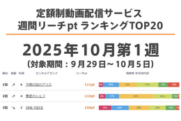 定額制動画配信サービス 週間リーチptランキングTOP20【最新週】