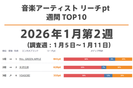 音楽アーティスト リーチpt 週間TOP10(2026年1月...