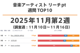 音楽アーティスト リーチpt 週間TOP10(2025年11...
