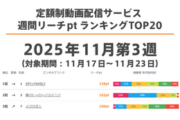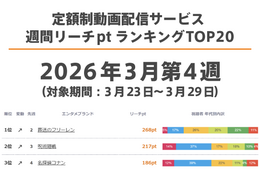 定額制動画配信サービス 週間リーチptランキングTOP20【...