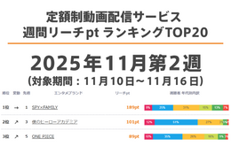 定額制動画配信サービス 週間リーチptランキングTOP20【最新週】